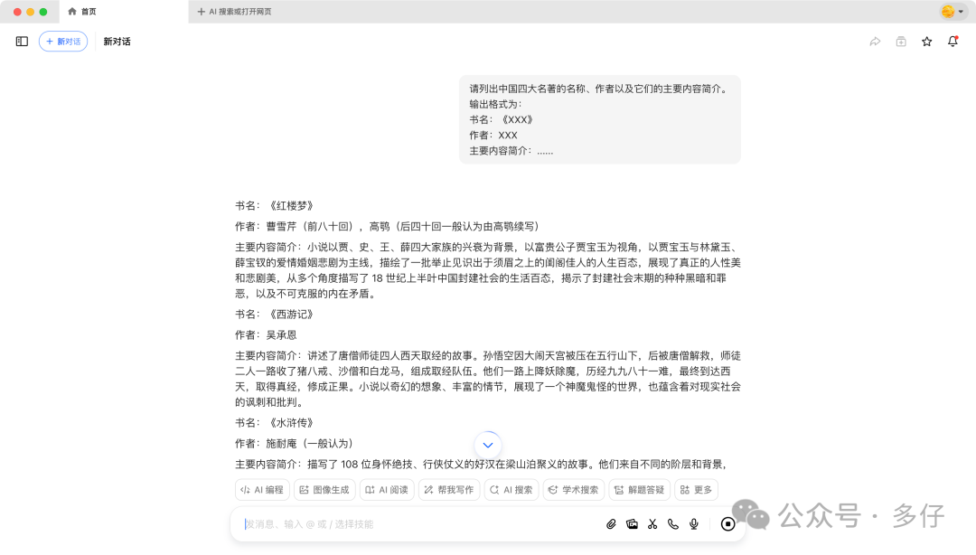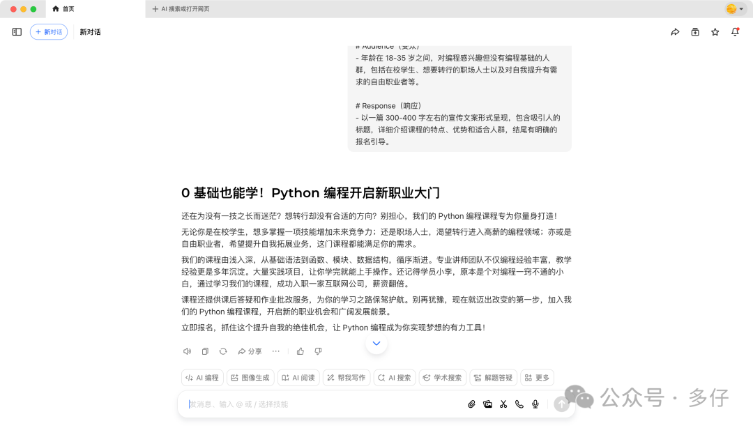 - Output(输出):告诉 AI 根据输入数据、上下文以及所接收的指令,经过处理后给出的最终结果的形式和内容。