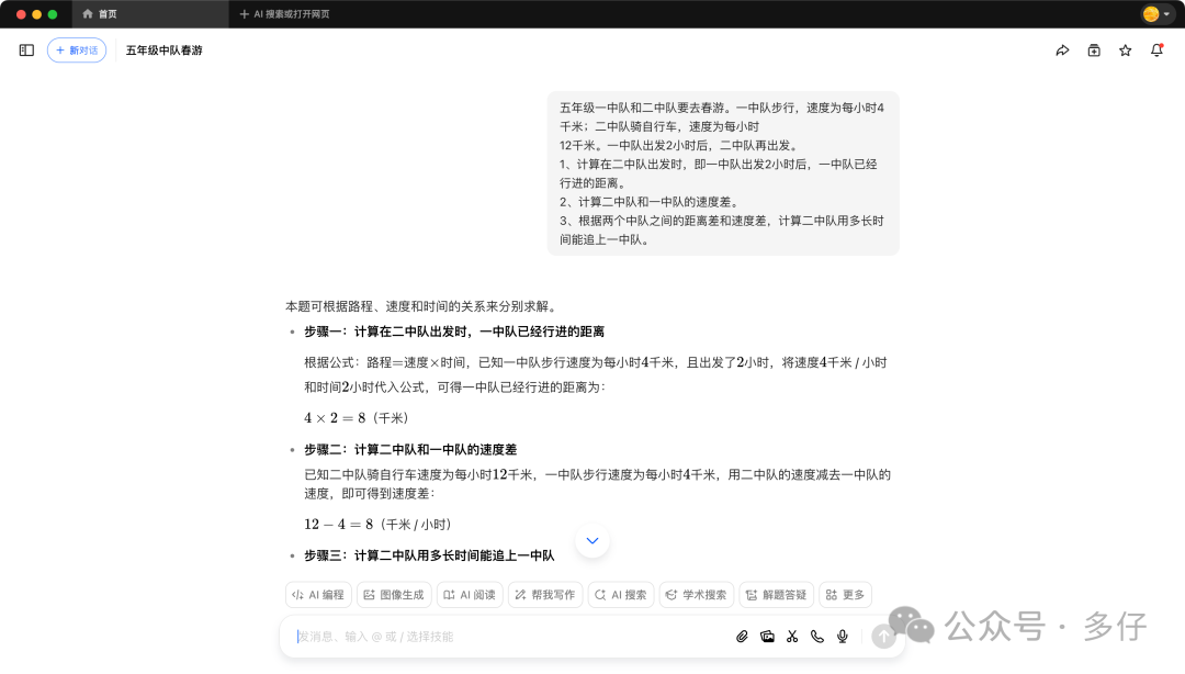 五年级⼀中队和⼆中队要去春游。⼀中队步⾏,速度为每⼩时4千⽶;⼆中队骑⾃⾏⻋,速度为每⼩时