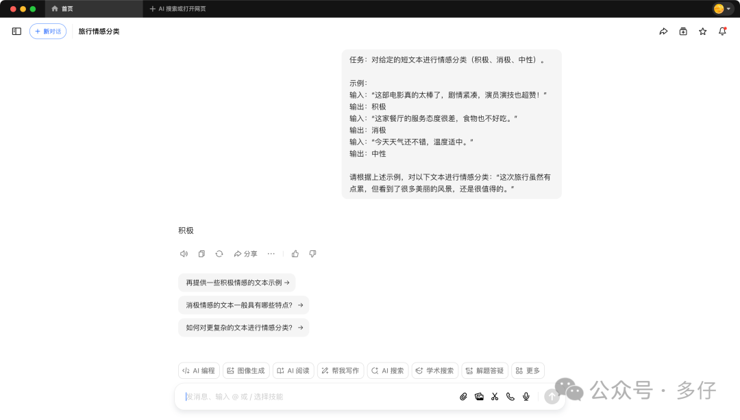 技巧 4:提供少量示例。为了让模型更好地理解任务的要求和期望的输出形式,给出一些具体的示例,模型可以参照示例来进行操作。