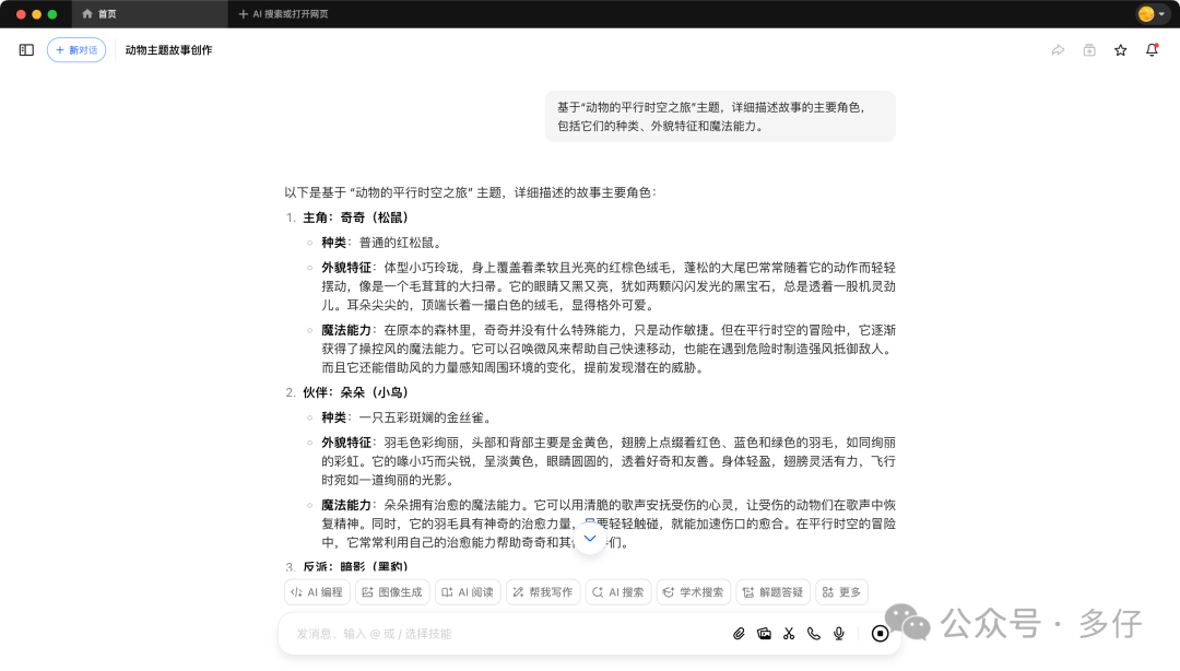 基于“动物的平行时空之旅”主题,详细描述故事的主要角色,包括它们的种类、外貌特征和魔法能力。