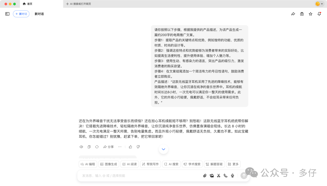 产品描述:“这款无线蓝牙耳机采用了先进的降噪技术,能够有效隔绝外界噪音,让你沉浸在纯净的音乐世界中。耳机的续航时间长达8小时,一次充电可以满足你一整天的使用需求。此外,它的外观小巧轻便,佩戴舒适,不会给耳朵带来任何负担。”