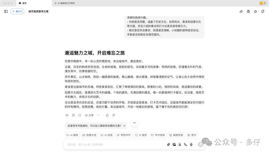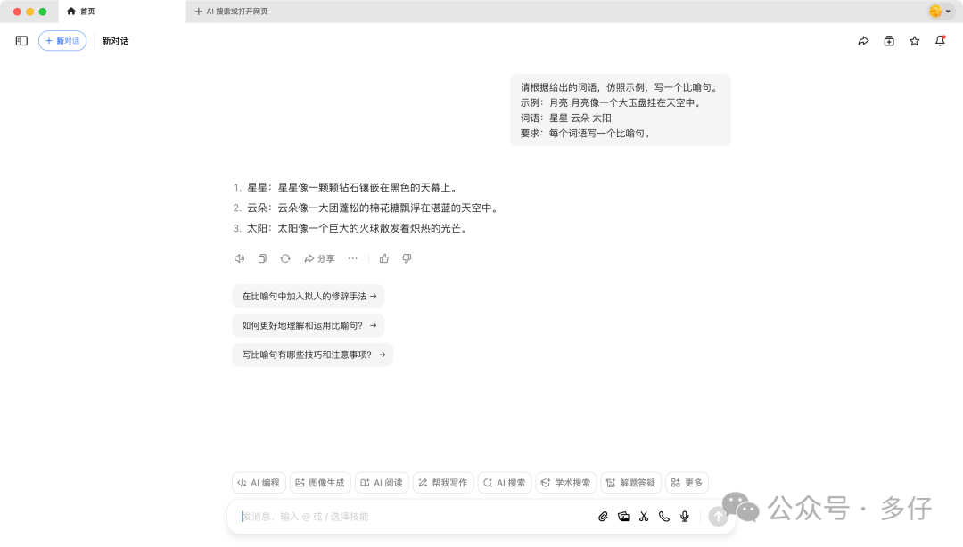 - Experiment(实验):对 AI 提出一些尝试性的要求或限定条件,以便得到更丰富多样的输出结果。