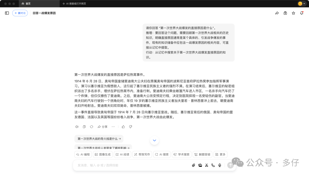 行动:从记忆中搜索关于第一次世界大战爆发直接原因的知识。