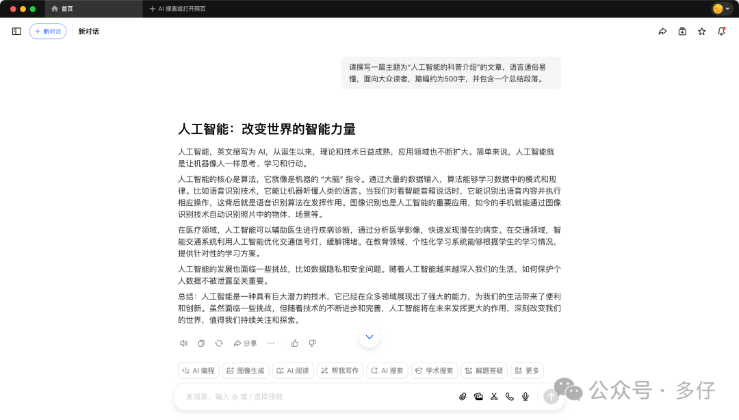 假设现在需要⽣成⼀篇关于⼈⼯智能的科普⽂章,要求语⾔通俗易懂,篇幅约为 500 字,幷包含⼀个总结段落。